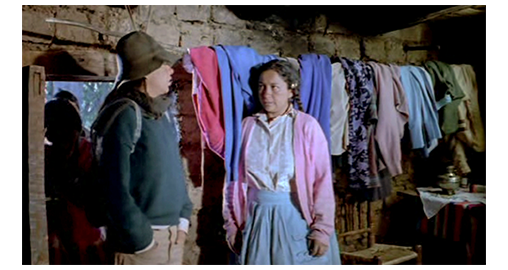 すると、いきなり、後ろから、「何してるの?」と声がし、フアンは驚いて振り向く。そこにいたのは、意地悪で悪辣なカルメン。「逃げたかったのね?」と決めつける(1枚目の写真)。「ううん」。「いいこと、シリロ、あんたが逃げても、あんたは殺さない。あんたのお母さんを殺す。ドミティラだったわね? 分かった?」〔何という、残虐性〕。「逃げるつもりじゃなかった。走ってたら、転んだ」〔少なくとも、後半は嘘〕。「信じないわ、シリロ、全然」。「本当だよ、お願い。逃げるつもりじゃなかった」(2枚目の写真)。「分かったシリロ。信じるわ。信じるけど、泣かないで。同志たちは、泣くのを見るのが好きじゃない。みんなは、涙は、勇気のない証拠だと言う」〔センデロ・ルミノソの思想の本質をどんどん暴いていく鋭い脚本〕。