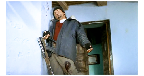 そこに、間に合って、村の警護団が駆け付ける。ウィルメは処刑どころではなくなり、銃を構えて応戦する。広場に集められていた村人(多くは女性)は一斉に散らばって逃げ出す(1枚目の写真)。銃撃戦で最初に射殺されたのが、ウィルメ(2枚目の写真)。左肩、右腿、胸、右脇腹に命中。2番目は、役立たずのフェルミンで、処刑の意味で、胸や肩に4発を浴びる(3枚目の写真)。