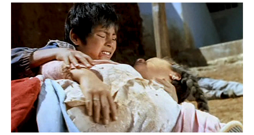 自分が殺されると確信したフアンは、「母ちゃん」と抱き着く。母は、自分がテロ組織に参加したのがこんな結果を招いたので、「許してね、フアン」と謝る。フアンは、「うまくいくよ。そしたら離れない」と、母に抱き着く(1枚目の写真)〔紙の鳩が頭にある?〕。一番の悪者ウィルメは、そこからフアンを引き離し、高く掲げ、「こいつは 裏切り者だ!」と宣告する(2枚目の写真)。そして、フアンを下に降ろすと、「奴は人民を裏切った! 家族全員が裏切り者だ! だから罰せねばならん!」と言い、ナイフを取り出す。ナイフを胸に突き付けられたフアンは、泣き叫ぶ(3枚目の写真、矢印は伍長を殺した時のナイフ)。