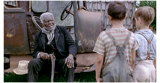映画が始まると、オープニングクレジットの間じゅう、右手で杖をついた1人の黒人の老人が、傷んだ靴〔左の靴の先端の革が大きくめくれている〕を履き、未舗装道、野道、ぬかるみ、夜道をトボトボと歩き、あるいは、黒人の荷馬車の後ろに座らせてもらう姿が映る。老人が 「ノースカロライナを出て、バージニアに入ります」という標示板に差しかかった時、白人の運転する1台のボロトラックが追い抜きざま、荷台に乗った2人のロクデナシの1人が 「おい、黒んぼ、道路を歩くな!」、もう1人が 「バージニアに、来るな!」と罵声を浴びせていく(1枚目の写真)。その直後、場面はガラリと変わり、1人の白人の少年が、指に持ったビー玉を、他のビー玉群を狙い撃ちしようとする姿が映り(2枚目の写真)、同時にマーティン・シーンによるナレーションが始まる。「1935年、私の10歳の夏は シャドラックにより、忘れ得ぬものとなった。彼は、私の人生に、光と影を もたらすことになる」。少年が、ビー玉の一人遊びを終えてバルコニーに行き、ボウルの中の豆を取ろうとすると、テーブルに座ってインゲンマメの下処理をしている黒人のメイドが、「触らねぇで、ポール! 食事だに、手ぇ洗って。時間ですだ」と、ポールの手をポンと叩く(3枚目の写真)。