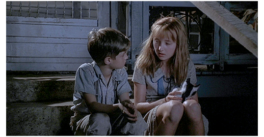 食事が終わり、まだ明るいので〔バージニア州の夏の日没は午後8時〕、ポールはダブニー家の前に着く。「私は、ダブニー一家が大好きだった」(1枚目の写真)「私は子供だったから、彼らが不運の連鎖の犠牲者とは知らなかった。大恐慌で暮らしは悲惨だった。でも、私のような甘やかされた孤独な一人っ子にとって、子供が7人という大家族がうらやましかった。3人の息子は、モールと呼ばれていた。区別は、リトル、ミドル、ビッグで、私は本当の名前を知らなかった。3人とも、風呂に入ったことがないので、吐き気を もよおすような体臭が漂っていた。一方、4人の娘たちは清潔で香(かぐわ)しく、私の お気に入りは 末娘のエドモニアだった」。そこに、ポールとほぼ同年齢の汚い子が現われ、「やあ、ポール」と声をかける。「やあ、リトル・モール」。「ビー玉、持ってるか?」。「ほら、ちゃんと」。「エドモニアの弟のリトル・モールは、間違いなく、家族中で一番臭かったが、初めての無二の親友だった」。2人は、すぐにビー玉遊びを始める(2枚目の写真)。すると、7人の子供の母親トリクシーが、ベランダからコンクリートの階段を素足のまま下りてきて、「あら、ポール、元気?」と、ビール瓶を持ったまま 話しかける。ポールは、行儀よく立ち上がると、「上々です。ありがとう、マム〔ma’am〕」と返事し、抱き着く。「暑いわね」。「はい、マム」。トリクシーは、ちょうどドアを開けて出てきたビッグ・モールに、「新しいビール、ある?」と訊く。「ううん、母さん、これが最後のヤツさ」。そう言って、手に持ったビール瓶を母に渡す。トリクシーは、手に持っていた方のビールを飲み干すと(3枚目の写真)、それを庭〔庭と言うよりは空き地に近い〕に投げ捨てる。そこに、エドモニアが来たので、「エドモニア、夕食の支度 手伝って」と命じるが、エドモニアは 「今日は ポール」と微笑みかける。