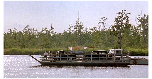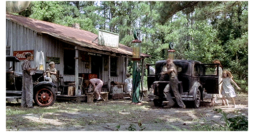 車は、典型的なバージニアの自然の中をゆっくりと走る(1枚目の写真)。この辺りは、首都ワシントンから約100キロ南に位置するが、現代でも、野原と森と沼と川しかない。一行は、木造のフェリーに乗るが、これは川を横切るためのものではなく、川に沿って移動するためのもの(2枚目の写真)。バーノンとトリクシーが欄干に立ってカモメの話をしていると(「ひょっとして、食べれらるかしら?」。「硬いから、喉に詰まるぞ」)、エドモニアがやってきて、「シャドラックが、ズボンの中に ひどく漏らしたの」と 父に報告する。「こん畜生! 奴は、唯の99歳の赤ん坊だ!」。エドモニア:「ひどい 臭いなの」。「あの ど阿呆、出かける前に、なぜトイレに行かんかった? 農園まで、ずっと車内で一緒なんだぞ」。トリクシー:「黙って、バーノン。可哀そうな老人なのよ。あなた、50年後に腸を制御できる?」〔膀胱と言うべきだが、当時は、医学的知識がなかった?〕。「俺は、ズボンに漏らさんぞ」。車に戻ったトリクシーは、シャドラックに 「いいわね、シャッド。気にすることはないのよ」と優しく話しかける。そう言いつつ、思わず鼻を押さえるので、かなり臭いのだろう。そのあと、車の中での描写は一切なく、最初のガソリン補給所兼店舗の前に車が停まると、ドアが同時に全部開き、息も絶え絶えの子供たち5人と、バーノンが飛び出てくる(3枚目の写真)。