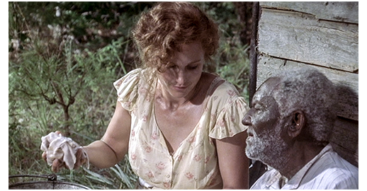 トリクシーはシャドラックを立たせると、屋外トイレに向かう。今までにも行ったことがあるトイレに違いないが、これまで気にも留めなかったことが、新たな障害となった。木の粗末な扉に 「WHITE ONLY(白人専用)」と書かれていたのだ(1枚目の写真)。バーノンは 「ちきしょう!」と怒鳴り、「この クソったれトイレが、使えないんなら…」と文句を言い始めるが、トリクシーは 「あなた、黙ってて!」と黙らせ、シャドラックには 「いいわ、シャッド。私が、始末するから」と優しく言う。夫には 「あなた、バケツに一杯の水と、ぼろきれを何枚か」と頼む。トリクシーは、トイレの横にシャドラックを連れて行くと、「いいわね、シャッド。誰にでも、一度や二度は あるものなの。恥じることなんて何もないのよ。すぐ、きれいになるから」と、暖かい言葉をかける。頼んだものが届くと、トリクシーは水でシャドラックをきれいにしようとする(2枚目の写真)〔黒人が蔑まれていた時代に、こうしたことを嫌がらずに行うトリクシーは、最初に登場した時、ビールを2本持っていた女性とは別の存在に見える〕。バケツ1杯の水では完璧とはとても言えないだろうが、ズボンの代わりに布を腰に巻き付けたシャドラックが、トリクシーに腕を支えられて戻って来る(3枚目の写真)。バーノン から 「一緒に行けるように、なったか?」と訊かれると、口癖の「主を讃えよ!」〔一言ぐらいトリクシーに感謝しても罰は当たらないと思うのだが…〕 。