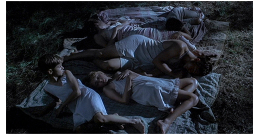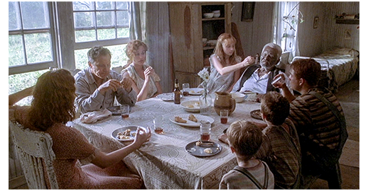 ポールとエドモニアは、夜が更けてもベランダへの階段に座っている。エドモニアは、「ここに放っておいて、大丈夫だと思う?」と、シャドラックのことを心配する(1枚目の写真)。ベンチを見たポールは、「安らかそうに 見えるよ」と答える。「シャドラックの言葉が分かるの、あたしたちだけみたい」。「多分ね。もぐもぐ話すのは、きっと歯のせいだ。あまり残ってないから」。このあと、エドモニアは眠りに行く。一方、夫婦部屋では、バーノンが焼いた鶏の骨付きもも肉を食べ、後ろでトリクシーが頭のシラミを取っている。「暑い盛りに、ベランダに 死んだ黒んぼ! どうすりゃいいんだ!」。「まだ、死んじゃいないわよ。それに、あの哀れな老人、農園に着くまで持ちこたえるわ」。「あの野郎に 歩かせるのは無理だぞ」。「いいこと、今は、あなたの “親族” の話をしてるのよ」(2枚目の写真)。「面白くもねぇ。クソったれめ!」。「子供たちは、とても なついてるわ」。翌朝、ポールとリトル・モールはベランダから聞こえてくるドスンという大きな音で目が覚める。シャドラックがベンチから落ち、枕代わりに乗せていたイスがひっくり返ったからだ。最初に現れたバーノンは、「何てぇこった! ちきしょう、長椅子が! くそ食らえ!」と文句を言いつつ、シャドラックの体を起こす。さらに、2人の兄が両側から持ち上げ、ベンチに座らせる。キッチンに行ったバーノンは、そこら辺にあったパンを 朝食代わりに立ったまま食べながら、「奴は、老衰じゃなく、長椅子で死んでたかも」と言って笑う。しかし、トリクシーは食料を紙袋に入れながら、「農園に行くなら、車を出した方がいいわ。もう、長くないから」と言う。「くそっ! 言っただろ。俺は、臨終の黒んぼを、農園には連れて行かん!」。しかし、結局は、車を出すことになり、前部座席には、バーノン、シャドラック、トリクシーの3人が、後部座席には、下の姉、エドモニア、下の兄、リトル・モール、ポールの5人が乗る(3枚目の写真)。