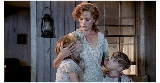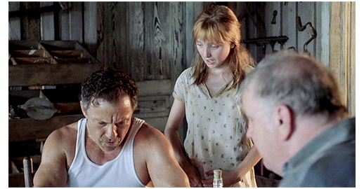 タッパハノックから戻って来たバーノンが、ベランダで、セドンという太った男と、ドミノ・ゲームをしている。バーノンの口癖が出る。「セドン、これは 確かな事実だ。全部、フランクリン・でくの坊・ルーズベルトが悪い。奴のニュー・ディール政策は阿呆の権化だ。俺が、昨年 幾ら稼いだと思う?」。「幾らだ?」。「とても、言えん。恥ずかしくてな。蟹を1匹5セントで売ってる黒人の方が稼ぎが多い」。「きっと、良くなるって」。「これ以上、悪くなりようがない。仕事が全然ないんだ。俺は無能だ。ウィスキー作りしかできん」。この時、エドモニアがベランダに出てきて、「父さん、シャドラックが死んだわ」と伝える(1枚目の写真)。そして、「私 怖い」とも。「何が怖いんだ?」。「分からない。死を見たからかしら」(2枚目の写真)。それに対するバーノンの返事は、彼らしいものだった。「死には、恐れることなど何もない。恐ろしいのは、生きることだ」。バーノンは立ち上がり、「生きることだ!」と繰り返す(3枚目の写真)。