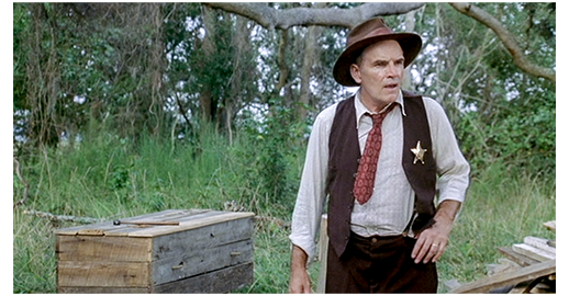 翌朝、バーノンとトリクシーが森の中で密造酒を運んでいると、保安官が呼ぶ声が聞こえてくる。2人は密造酒を隠すと、保安官の前に姿を見せる。保安官:「えらく、早いじゃないか」。バーノン:「35ドル分の仕事をしてたのさ」(1枚目の写真)〔正直な話〕。「年取った黒人の紳士は、どうなった?」。「上々だ」。「セドン・ワシントンが言っとったぞ、昨夜、ドミノの最中に死んだって。事実なのか?」。「2人で、ドミノをしてたのが?」。「黒んぼが 死んだことだ。事実なのか、違うのか?」。バーノンは 「なんでこう、どいつもこいつも、ベラベラとウチの話を しゃべりやがるんだ!」〔ジョーに続いて2人目〕と ひとくさり文句を言った上で、「そう、奴は死んだ。だから、死人なんかに構うのはやめて、もっと有益な仕事に専念したらどうなんだ」と、くどい保安官に文句。「立場上、死体を見せてもらう」。家の中に入ろうとした保安官に、バーノンは 「そこには、ない」と言う。保安官は、てっきり夜の間に埋めたと思い、「バーン、この前 言ったように、私有地に埋葬することは、バージニアの州法に違反し…」と言い始めるが、バーノンは 「奴は、そこだ」と言い、手製の棺桶を指す。そして、「タッパハノックの黒人の葬儀屋と段取りを決めてきた」し、保安官に、葬儀屋に電話して 「シャドラックが死んだ」と伝えるよう頼む。保安官はあっけに取られたような顔で話を聞いている(2枚目の写真)。「暑いから、急がんとな」(3枚目の写真)。保安官は、蓋を開けて確認することなく、「これでいいんだ、バーン。時が経てば 法も変わる」と、法が守られたことで機嫌がよくなる。バーノンは、「あのクソったれを、いったい どこに埋めたと思ったんだね?」とダメ押し。「済んだことだ。そう苛(いじ)めるな、バーノン」。