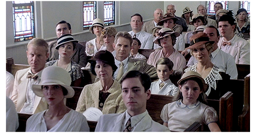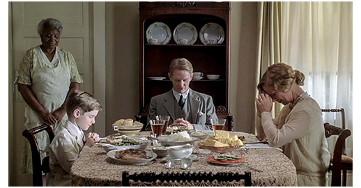 ポールが2階に上がって行くと、寝衣姿の母が鏡の前で髪を梳かしながら口ずさんでいる。ポールが母を見ていると(1枚目の写真)、ポールに気付いた母は、「夕食には きちんとした服でね」と注意する。そして、食事の前の祈りのシーン。父が 「神よ、すべての み恵みに対し感謝します。アーメン」と祈りを捧げ(2枚目の写真)、顔を上げると、妻に 「薬屋で、ノーマ・ディランシーに会った。今年のクリスマスのミサで、君に ソプラノを歌って欲しいそうだ」と話しかける。「クリスマス? 気の早い話ね」。「今は真夏だからな、ポリーン。それまでには きっと良くなる」〔母は病気〕。「復活祭までなら」〔復活祭は3月なので、半年では治りそうもないような病気〕。ポールは、「食べ終わったら、ダブニーさんちに行っていい?」と訊く。母:「ポール、もう、やめたら?」。「どうして?」。「だって、あの人達は、とても…」。ここで、父が援軍を出す。「あの一家は没落しただけだ。運悪くな。バーノン・ダブニーが一家を養ってる」。この言葉は、OKが出たことを意味する。