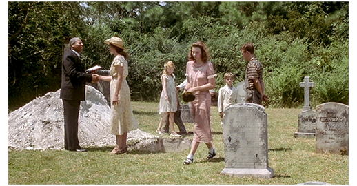 翌日の朝。看病役の母が眠っていると、早起きして花を摘んできたトリクシーが、ヒナギクの花をシャドラックの胸に置く(1枚目の写真、矢印)。そして、母を起こし、役割を交代する。日が高く昇った頃、1台の車が家の前に着く。降りて来たのは、この郡の保安官。ベランダの長いイスに座っていたルシンダに 「お早う」と言い 「父さんは、中かな?」と訊く。その時、ポールとリトル・モールは、ベランダの下で遊んでいた。「父さんと母さんはいないわ」。バーノンの車があるのを見ると、保安官は 「遠くじゃなさそうだ。待つよ」と言う(2枚目の写真、矢印は、バーノンとトリクシーに知らせに走るポール〔リトル・モールはランプと重なり見えない〕)。2人は、代々のダブニー一族の墓地にいた。バーノン:「俺たちより、墓の方が多い」。トリクシー:「次に来る時には、ゼラニウムの花でも持ってくるわ」。「何を植えたって、どうせ しぼんで枯れちまうだけだ」。ここに、リトル・モールとポールが来て、「父ちゃん、保安官が来た!」と知らせる。「蒸留器のことかな?」。「ずっと待ってるよ」(3枚目の写真)。「待たせとけ」。バーノンは3人を引き連れて場所を移動、「あっちに、シャッドの場所がある」と言う。そこには、小さな石碑が所狭しと立っている。「猫の額ぐらいの大きさなら、空いてるトコが あるだろ。この狭い場所に、奴のお仲間が いっぱい埋まってる。肩と肩が 擦れ合うようにな」。バーノンは、墓穴を掘る気でシャベルを持って来たのだが、妻に 「何も、暑い盛りに やらなくても」と言われ、「テーズウェル〔保安官〕の話でも聞いてみるか」と、戻ることにする。