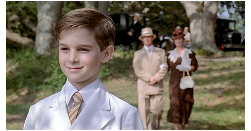 式が終わると、バーノンとポールの父は握手を交わす(1枚目の写真)。トリクシーは、「今日は、ポール」と声をかけ、両親には、「私たち、坊やが大好きなの」と笑顔で言って、ポールの鼻に触る。母:「ありがとう。ここで失礼しますわ。旅行の準備がありますの」。バーノン:「どこに、行くんです?」。父:「兄の姑が、ボルチモアで亡くなったので、明日、葬式に出かけるんです」〔ボルチモアはメリーランド州。ポールの家の正確な場所は不明だが、150-170キロほど北にある都市〕。トリクシー:「坊やには、恐ろしく長い旅ですわね」。母:「ポールは、メイドと一緒に留守番です」。「まあ、なら、我が家へどうぞ。坊やさえ よければ。大歓迎だわ」(2枚目の写真)。それを聞いたポールは、満面の笑み(3枚目の写真)。「まさか、そんな ご迷惑なこと」。「お母さん、お願い」。父が主導してOKする。その夜、母が苦しそうに何度も咳く。隣の部屋のポールは、たまらなく悲しくなり、耳を塞ぐ(4枚目の写真)〔母の病気は肺結核か肺癌〕。