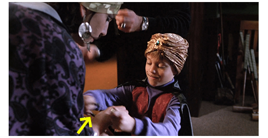 次のシーン。ザンボーニが玄関ドアを開けると、そこには、捩じれた前輪を左手に持ち、右手で自転車本体を支えているマックスがいた。鼻血と頬の泥はさっきと同じ。3人組にやられた足で、すぐに館までやって来たのだ。そして、「スティック、奪われちゃった」と告げる(1枚目の写真、矢印は前輪)。ザンボーニは、マックスが以前スティックを見つけた部屋に連れて行き、鼻血を拭ってやる(2枚目の写真)。「フーディニって誰?」。「史上、最も偉大なマジシャンの一人だ。辛い人生を歩んだ。多くの困難にぶつかったが、いつも乗り越えたんだ」。「虐めっ子に捉まったことある?」。「生涯を通じてな」。「なら、なぜ “虐めっ子” なの?」。「私が? 虐めっ子じゃないぞ」。「子供が嫌いでしょ?」。「誰がそんなことを?」。「あなただよ。奥さんが消える前に、あなたが言った最後の言葉」(3枚目の写真)。「まるで魔法使いだな」。「コンピュータで見たんだ」。「最新の技術は凄いな。鼻の手当ては済んだから、帰ってくれ」。「でも、自転車も直してくれるって」。「そうだったな」。