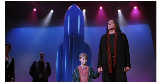 ショーは最後のイリュージョンとなり、ザンボーニは、会場からボランティア1人の参加を求める。多くの手が上がったが、「子供だけ」と制限をつける。それでも、多くの手が残ったが、マックスは席から飛び上がって手を高く掲げている。そして、マックスがボランティアに選ばれる(1枚目の写真)。ステージに上がったマックスの背後で幕が上がると、そこには青と赤のロケットが立ち並んでいた。どちらか1つを選べと言われ、マックスは青いロケットを選ぶ。ロケットの蓋が開けられ、中にマックスが入る(2枚目の写真)。次に、2基のロケットは横に倒され、赤いロケットの中に黒ジャガーが入る(3枚目の写真)。