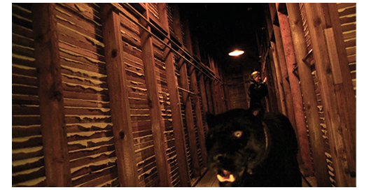 プレスコット:「留守なんだ」。ユーリ:「家に帰れるな」。ゾーイ:「プリンセスを捉まえないと」。ユーリ:「見張りのライオンは?」。ビーンズ:「みんなで行って、プリンセスを捉まえたら素早く出る、ってのはどうかな?」。ザンボーニは、留守ではなく、上の階のベランダから その様子を見ている。5人は、庭にある穴の中に落ちる。中は真っ暗。プレスコットがラップトップのスイッチを入れ、モニターの光で周りの様子を見る。そこは、マネキンのようなものが多数廃棄された地下倉庫のような場所だった(1枚目の写真)。幸い、壁に付いた照明用のスイッチを発見し、暗闇の世界から解放される。5人は、その倉庫にあった唯一のドアを開ける〔映画にはないが、そのあと長い階段を上り、地上階に出る〕。すると、そこは館の一階、高い天井で、変わった時計もある〔30分ごとに、大きな木の鳥が飛び出してくる〕。その後、5人の “探検” の映像が流れる。一方、ザンボーニは壁と壁の間に設けられた隠し通路に設けられた覗き穴から、子供達の様子を窺う(2枚目の写真、手前は黒ジャガー)。そのうち、ゾーイは山羊を見つけることができたが(3枚目の写真)、落雷の音に驚いて転倒した際、お尻が大きな植木鉢にはまってしまい、山羊とはまた別れ別れに。