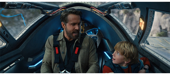 2人のアダムは、一緒に森に入って行く。子供のアダムは、歩きながら、「あんたが、未来の僕だなんて信じられない」と言い、大人のアダムは、「えらく簡単に受け入れたが〔you came to terms with that pretty quickly〕、ちょっとはびっくりしたよな」と言う。「で、なぜ、ここに?」。「救出作戦だ。ここに来るつもりはなく、2018年を目指してた。できるだけ早く行かないと」。「2018年で、誰を助けるつもりだったの?」。「やめてくれ」。「じゃあ、少なくとも、どうやってここに来たか教えてよ」。大人のアダムが、首から下げた小さな装置に触れると、森の真上に5角形の青い物が2つ、一瞬光って消える。「あれ何?」。「クソッ」。「何?」。「プランAに変更だ。お前も仲間になる。いいか、あのタイム・ジェットは、操縦者のDNAで作動する。俺は怪我してるから、ジェットは飛ばせてくれない。だから、中に入って修理もできないんだ。誰ならできると思う?」。それだけ言うと、大人のアダムは、子供のアダムに小さな装置をつかませる〔この設定は、本質的におかしい。大人のアダムは怪我をしているが、それとDNAとは無関係。DNAの損傷は紫外線曝露、熱ストレス、毒物、殺虫剤等の環境要因や、化学療法薬やウイルス感染等の医学要因などで起きる。現時点では、大人のアダムが銃撃で負傷していることを、小さな装置を触っただけで判断することは不可能。この設定は、子供のアダムを冒険に引き込むためだけに導入したものなので、かなりの無理筋だが、これがないと映画が先に進まないので仕方ないのかも…〕。すると、今度は、ジェットが姿を現わし、搭乗用のフローティング装置が舞い降りて来る(1枚目の写真、矢印)。2人がその上に乗ると、装置は再び上昇を始める(2枚目の写真)。大人のアダムは、子供のアダムを操縦席に座らせ、パネルを操作して、損傷個所を調べる。子供のアダムが、装置に触ろうとすると、「お前が起動すれば、奴らに見つかる。もし、奴らが この時代にいれば」と言って、触らせない。「『奴ら』って誰?」。「『奴ら』は極秘事項だから、訊かないで欲しい」(3枚目の写真)。かくして、損傷した継電器は遮断され、ジェットの自動修復が始まる〔どうして、『起動』せずに そんなことが可能なのか、分からない〕。「どのくらいかかるの?」。「50%の能力だから、俺の傷が治るより少し早いくらいかもな」。ここで、子供のアダムが話題を変える。「あんた、 このこと、覚えてた?」。「何を?」。「これだよ、ここで、今起きてること… あんたが2022年にいるってこと。これが僕に起きてるってことは、あんたにはずっと前に起きてたってことになる〔しかし、大人のアダムは覚えていない〕。多元宇宙なら別だけど、こんなことが起きたことによる波紋は、もう一つのタイムラインを作っちゃうんじゃないかな」。大人のアダムは、多元宇宙を否定し、別のタイムラインも否定する。「固定された時間〔fixed time〕に戻った時、俺の記憶… 俺たちの記憶は矯正され調整される。だが、ここにいる間はそうじゃない」。「『固定された時間』? それって、何?」。「お前が真に属しているタイムラインは一つ。俺みたいに宇宙をもて遊んでいない場所だ。それが、お前の固定された時間。お前が実際に属しているタイムラインだ」。「じゃあ、あんたがここにいて、こんなことを話してることで、僕の未来を全部変えちゃったかもしれないわけ?」(4枚目の写真)〔矯正され調整されるから〕。「正直に言おうか? お前の未来は どっちみちかなり悲劇的なんだ」。