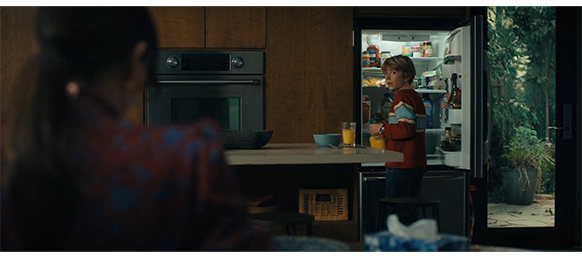 辺りが暗くなった頃、母は、友人と外食に出かけるから、1人でディナーを食べるよう声をかける。「どの、友だち?」。「デレクよ、一緒に働いてるの」。「デートに行くんだ」。「デートじゃないわ」。「ドレスは、デート用だね」。「ちゃんと話し合った方がいいわね」(1枚目の写真)。アダムは、「びっくり〔Dear God〕、やだよ」と言って立ち上がって、背を向けと、冷蔵庫を開けて何かのビンを取り出し、バタンと閉めるが、性能が悪いのか、反撥力で開いてしまい、アダムは手で押して閉める(2枚目の写真)〔後に関係する重要なシーン〕。アダムは、急いで出かけようとする母が 背中のジッパーを閉め忘れているのに気付き、「ちゃんと考えて〔Make good choices〕」と言いながらジッパーを閉める。母は、「停学中の子に言われちゃった」と一言余分なことを言った後で、「愛してるわ、坊や」と言い、アダムも、「僕もママを愛してるよ。もしかしたら思っている以上に」と答える。それども、最後の母の言葉は厳しい。「電子レンジなし。呼び鈴には出ない。ビデオ・ゲームは禁止」。しかし、母はいないので、アダムは、愛犬ホーキングと一緒にビデオ・ゲームに熱中する(3枚目の写真)。