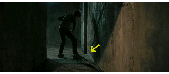 同じ頃、いつもようにコカインを吸っていたマックスは、自分の作った地図を見て、この家が、色々な誘拐事件の中心に位置しているのに気付く。そして、マックスは、地下室へ降りていくドアを開ける。地下室の照明が点いたので、いよいよ決戦の時だと思ったフィニーは、土を詰めた受話器を手に持って待ち構える。重い鉄扉がそろそろと開き、マックスが顔を見せる。彼は、中を見て、「ありえん〔No fucking way〕。彼が、ここに何かを隠してることは知ってたが、まさか、なんてことだ〔holy Mary, mother of God〕!」と、驚嘆する。フィニーはマックスによって助け出されると思いきや、そこに、フィニーの死骸を入れる袋を買いに行って戻ったグラバーが、仮面を被り、斧を持って階段をそっと降りて来る。そして、実の弟のマックスの頭に 斧を振り下ろす(1枚目の写真、矢印は斧)。マックスは即死。上半分だけの仮面を付けたグラバーは、地下室に入ると、フィニーに、「貴様が、俺に何をさせたか見てみやがれ。弟を殺させたんだぞ」と、勝手な言い掛かりをつける。そして、「貴様は、これから、他のガキどもと一緒になるんだ。言うことをきかん連中とな」と、死を宣言する。その頃、警察は 「7741」の家の玄関に到着している。グラバーは、マックスの頭から斧を引き抜くと、「いつもはナイフを使う。だが貴様は特別だ。時間をかけて、とことん苦しめてやる」と言い、「サムソン!」と、獰猛な犬を呼び寄せる。警察は、応答のない玄関を破り、中に押し入るが、中には誰もいない。グラバーは、斧を手にしてフィニーに向かって行く(2枚目の写真、矢印は斧)。彼が、斧を振り上げて叩き下ろした瞬間、フィニーは逃げて、便器のある通路に走り込み、ケーブルの先端を掴む。そして、グラバーが通路に突進して来ると、ケーブルを引く。ケーブルは、L字型になっていて、通路の入口全体を遮断した後、壁に沿って、フィニーまで伸びている。グラバーは、ケーブルに足を引っかけて転倒し(3枚目の写真、中央の下向きの矢印は壁に沿ってケーブル、右側の矢印は、穴が見えないように被せてあるビニールシート)、そのまま、ビニールシートと一緒に深い穴に落ちる(4枚目の写真、空色の矢印は落下方向、左の矢印はビニールシート)。穴の底には、窓にはまっていた鉄格子が斜めに置いてあり、グラバーの足は、それにぶつかって右足は恐らく捻挫し、左足は動けなくなる(5枚目の写真、矢印は鉄格子)。