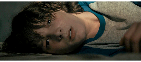 フィニーがベッドで寝ていると、電話で目が覚める。電話を取ると、「君は、僕がビリーだと言った」と話し始める。さっきの少年だ。「ビリー・ショーウォルター」。「そう呼ばないで。もう覚えてないから、今の僕じゃない」。「じゃあ、どう呼べばいい。覚えていることは?」。「言っただろ。新聞配達だ」。「分かったよ、新聞配達の子」。「君の前の壁が見えるか? 床との間に隙間があるだろ」。「うん」。「僕、長いケーブルを床から引き抜いて、隠したんだ」。「それで、何をすればいい?」。床に転がっていた飲み物のビンが動き出し、先端がもち上がって、鉄格子のはまった窓を指す(1枚目の写真、⑤、矢印は光の窓を指すビン)。その頃、学校の保健室で眠っていたグウェンは、ある夢を見る。それは、新聞配達をしていた頃のビリーの夢(2枚目の写真、★)。夢の大半は、彼が配達中に拉致されたところで終わる。夢の最後に、フィニーが連れていかれた煉瓦建ての1階家の全体像が一瞬映り、目が覚める。フィニーは、床と壁との隙間に指を入れ、そこからケーブルを一気に引き出す(3枚目の写真、矢印)。フィニーは、さっそく窓の下まで行き、鉄格子に向かって何度もケーブルを投げ上げるが、巧く絡まってくれない。