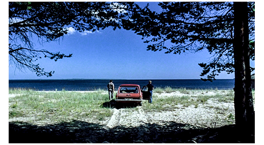「荷物を車まで運ぼう」。2人は、それぞれの荷物を持ち、ふらふらしながら車まで歩いて行く。2人は、バックドアを開け、荷物を全部中に入れる。そして、兄がバックドアを閉める(1枚目の写真)。そして、「ちょっと 休もう。そしてら、あれを運ぼう」。疲れたイワンがバンパーにもたれてウトウトしていると、兄の、「パパ!」という叫び声が聞こえる。イワンが起き上がって声のする方を見ると、ボートが岸から離れ、兄がそれに向かって走って行く。イワンも、「パパ!」と叫んで走り始める(2枚目の写真)。しかし、湖底に衝突した弾みで応急的に塗ったタールが傷ついたボートの中には湖水がどんどん入り、父の死体も沈んでいく(3枚目の写真)。兄は、水際の所で止まり、イワンだけが 「パパ!」と叫びながら湖の中まで走って行く。4枚目の写真は、映画が始まってすぐに流れる映像。それは、この沈んだボートの数ヶ月後(?)の姿。右下の白いものは電動船外機。父の死体は、所期の目的を果たして天に戻ったのか、魚に食べられたのか、どこにもない。