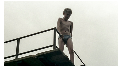 「日曜日」と表示される。長い防波堤の先端に 鉄枠の上から木を貼り付けた高い塔が立っている。このロケ地は、後述するラドガ湖のPyatirechyeという村にあるSainasaari灯台。1枚目の写真は、グーグル・マップの定点写真。この防波堤は長さが650mもある。この塔のてっぺんには4人の少年がいる。下からは、「飛べよ、決めただろ。階段を使って降りる奴は、腰抜けのクソッタレだ」の声がかかる。年長のアンドレイが2人の飛び降りを指導する。2人だけになると、弟のイワンは、「ねえ、アンドレイ、階段で降りちゃダメ?」と訊く。「お前 バカか? クソッタレって言われたいのか?」。アンドレイは、「俺が先に飛び降りる。すぐに続くんだ。いいな?」と言って飛び降りる(2枚目の写真)〔足から、真っ直ぐ落下するので、いわゆる “飛込” ではない〕〔監督は、このシーンを一種の “洗礼” と捉えている⇒水に飛び込んだ兄は、父なる神に帰依できる人間になっている〕。イワンは、片足を柵から外に出し(3枚目の写真)、続いて両足を出すが、兄に 「チビ、早く飛べ」と言われると、柵を跨いで元に戻り、その場にしゃがみ込む。一番年長のボスは、「おい、そこで何してる。怖いんなら、階段で降りろ。待っちゃられねぇぞ」と急かす。兄は 「ワーニャ〔イワンの愛称〕、来い! 飛べ!」と叫ぶ(4枚目の写真)。待っていても何の反応もないので、放っておいて歩き出す〔イワンは、このあと、“父” に対して 汚い言葉でわめき散らすくせに、このていたらくは実に情けない〕〔イワンは、父なる神に帰依できる人間になれていない、という暗示〕。