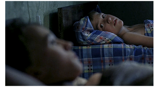 湖面に押し出し、電動船外機を付けると、ボートは快調に動き出す。ボートの後方にも前方にも陸地は見えない。ところが、天気がまた急変し、それに合わせるように、電動船外機がストップする〔そんな安物を購入した?〕。この次の父の言葉は、あまりにひどい。電動船外機の故障に関して何らかの詫びがあってしかるべきだと思うのだが、彼は、「オールを持て」とだけ命じる。2人が場所を移動し、ボートの中央に座れると、「何を見とる。漕げ!」。2人は、そもそもボートを漕いだことがあるのだろうか? 息を合わせて同じ力で漕がないと、ボートは真っ直ぐ進まない。それを、いきなり「漕げ」とは、ひどい父親だと思う。しばらく時間が経ち、辺りは暗く、そして、土砂降りに。父の叱咤が飛ぶ。「イワン、船首を波に直角に保たんか、この間抜け〔бестолочь〕!」。「無理だ!」。「チームでやろう。オールを上げろ! じゃあ行くぞ。漕げ」。2人は同時にオールを入れて漕ぐ。父の号令で、2人は漕ぎ続ける(2枚目の写真)。体力のないイワンが、「もう無理だ」と音を上げる。「やれるぞ」。「あんたがやれよ。強いんだから」。父は、それには答えず、号令をかけ続ける。ボートは、何とか目的地の島に辿り着く〔この場面の父の印象は悪い。イワンに号令をかけさせ、彼が漕ぎ役に回るべきだったと思うからだ〕。雨は止んでいる。父は、荷物を2人に持たせて砂浜に上げ、ボートを木の杭に縛り付ける。そのあと、砂浜で焚き火。ここでも疑問。①枝はどこにあったのか? ②雨で濡れていて なぜ燃えるのか? 火の前に座った3人。イワンは。掌に布を巻いているが、オールを漕ぎ続けて皮が剥けたのだろう。父は、まず、ウォッカの入った水筒を取り出すと、アンドレイに、「息を止めて呑み込め」と言い、少量を飲ませる。次に、イワンに飲ませようとすると、「要らない」と言う。父は、イワンの顎を掴むと、90度回転させて自分の方を向かせ(2枚目の写真)、「飲め」と強要する。イワンは 仕方なく飲むと、そのまま立ち上がり、いつの間にか出来上がっていたテントの中に入る〔最初のイメージでは、“父”、イコール、“キリスト” を指していたが、今の父はサタンに近い〕。テントの中で、兄は 「大丈夫か、チビ?」と訊く。「今度、僕に触ったら、あいつを殺す」(3枚目の写真)。「本気か?」。「触ったら、殺す」。
