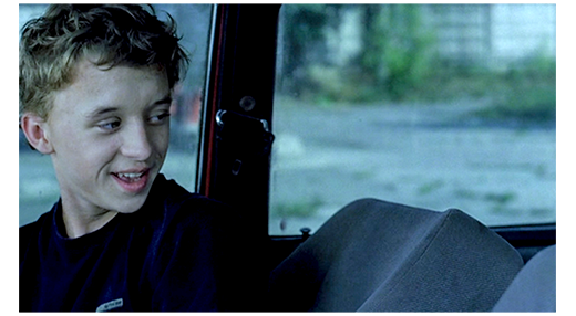 「火曜日」と表示される。最初のシーンは、イワンが後部座席に座って路面をじっとみている姿(1枚目の写真)。助手席の兄は、地図を持ったまま眠っているが、この地図で場所は特定できない。ただ、湖がたくさんある場所で、これはサンクトペテルブルクの東部、フィンランド国境の南部の特徴なので、ロケ地とも合致している。その間、イワンはずっと起きている。寡黙な父は、そんなイワンをルームミラーで見て 「イワン」と呼びかける。返事は 「何?」。言い方が悪いので、父は 「何、パパ?」と言う。「何?」。「『何、パパ?』だ。なぜ、そう言わん?」。「何、パパ?」。「良くなった。なぜだ? 自分の父親をパパと呼ぶのが、決まり悪いか?」。「ううん」。「嘘付くな」。「嘘なんか付いてない」。「息子なら、パパと呼ぶんだ。いいな?」。「はい、パパ」。「それでいい」。車はさらに走り、途中の公衆電話で父が電話を掛けている。その時は、イワンが眠っていて、兄が起きている。イワンが目を覚まして 「アンドレイ、僕たち どこにいるの?」と訊くと、兄は 「やっと起きたか、チビ」(2枚目の写真)「ずっと眠ってるかと思ったぞ」と、笑いながら言う。「ずっと眠ってたのは、そっちじゃないか。まだ遠いのかな?」。「あと30キロくらいあるんじゃないかな」。「彼、どこにかけてるんだろう?」。「さあな」。「お腹減った」。「ガマンしろ。もうすぐ町だ。そこで食べる。パパがそう言ってた」。「今すぐ食べたい」。父が戻って来ると、車はすぐに出発。途中、兄が窓から身を乗り出して、前方をカメラで撮ろうとすると、イワンが、「そんなくだらないもの撮らないで、僕を撮ってよ」と声をかけ、兄もそれに応じる(3枚目の写真)。ここまでは、波風は立っていない。