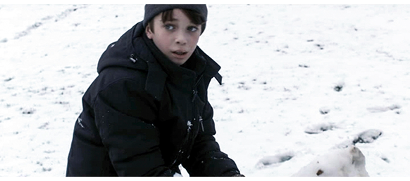 モリーのスタジオでの短い、進展の見られないシーンの後、館の雪原の前でただ立っているトーマスが映る。少し離れた所では、ノアが雪だるまを作っている(1枚目の写真、矢印は “体” の部分)。ノアが大きな “頭” を “体” の上に苦労して乗せると、何を考えたのか、トーマスが足元の雪を集めて雪玉を作り、ノアにぶつける。ノアは、まさか祖父がと、びっくりしてトーマスを見る(2枚目の写真)。そこに、トーマスが2発目を命中させ、ノアも応戦を始める(3枚目の写真、矢印は雪玉)。トーマスは、施設で 娘から 「私が小さかった頃、私のこと考えたことある?」と言われたことを思い出し、ノアに対して “お祖父ちゃん” らしく振舞ってみたのだろうか?