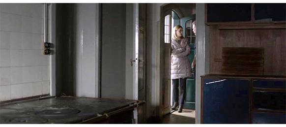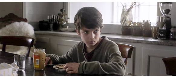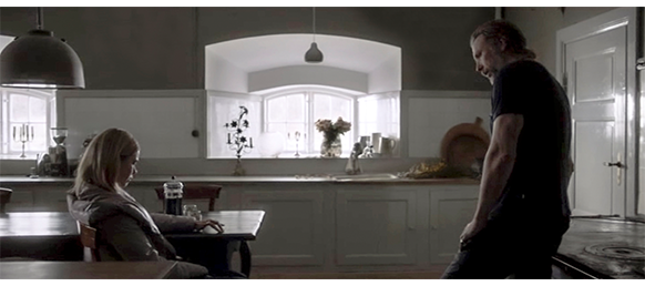 そのあと、トーマスは、ノアを食堂に呼び、「インターナショナル・スクールって知ってるか?」と尋ねる。ノアは、食パンにジャムを塗りつけていて答えない。「全寮制の学校は?」。無言。「ケイトが君のために寄宿学校の手配をした」。そう言うと、トーマスは、「私は、いつも家族がしていたように、飲む」と言いながら、ウィスキーをコップになみなみと注ぐ。「というか、飲まない。投げるんだ。踊ったり、歌ったりなんかしない。へど、小便、血で窒息するまで、酒をぶちまけたり、ドラッグを吸ったり…」と、昔のすさんだ時代の話をし始めるが、ノアがじっと睨んでいるので(1枚目の写真)、「そんな目で見ないで」と言う。トーマスは、何度も見るなと注意するが、ノアが止めないので、ウィスキーのコップを投げ捨て(2枚目の写真、矢印)、食堂から出て行く。トーマスは雪の森の中に入って行くと、自分の無力さに絶望する。その夜、モリーと会ったトーマスは、「私は国に戻る。ノアは寄宿学校に行く」と言う。「ええ、ケイトから電話があったわ。家でノアの話をしたの。ノアは、学校が休みの時、私たちと一緒にいればいい」(3枚目の写真)「クリスマスとか祭日、家族の週末なんかがあるなら、その時も」。「君は、いい人だ。私には、何もできない。誰にも、何も、与えられない」と、自分の無力さ〔やる気のなさ〕を語る。