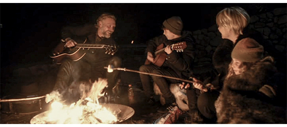 あれから どれだけの日数が経過したのかは分からない。トーマスは、朝、ピンポンによってたたき起こされる。「お早う! ここに彼女いる! あなたの娘! 来て」。娘は施設から出られないハズなので、何事かとキッチンに行く〔当然、ピンポンが場所を教えたのであろう〕。「どうした?」。「私… 惨めなの」。「逃げたな」(1枚目の写真)。娘は 「最低の母親だわ」と言って泣き出す。「ノアの世話をすべきだわ。ちっちゃなノアの。もう、あそこにいられない。無理よ。ノアに会いたい。生きた心地がしない。家に戻りたい」。トーマスは 「君は、戻るべきだ」と たしなめる。「できない」。「できるとも。今すぐ戻らないと」。「できない」。「あと数週間じゃないか。ノアはここで元気だ。だから、やるんだ。戻るんだ」。「できない」。「いいや、できる。君にはできる」。「できる?」。「ああ、できる。やらねば」。「分かったわ」。娘は、涙を拭うと、「ノアには、こんなトコ見られたくない。黙ってて」と言い、トーマスは、「ここから出て行けばいい」と、キッチンの裏口を指す。そして、娘は指示に従って、裏口からこっそり出て行く(2枚目の写真)。再度、不明な日数が過ぎ、ある夜、トーマスとノア、モリーと孫娘(?)、マネージャーが、屋外の焚火に集い、トーマスの主導でノアがギターを弾き始める。ノアの演奏が順調に波に乗ると、2人の合奏に会わせてモリーが歌い始める。そして、最初のところを歌い終えると、モリーは、ノアに「ソロ」と声をかける。そこからは、ノアのソロ演奏に合わせてモリーが歌い、次第にスピードを上げて行く。それでも、モリーに合わせていけるので、ノアとトーマスは笑顔になる(3枚目の写真)〔ノアの笑顔は3回しか見られない(それほど不幸)ので貴重な瞬間だ〕。
