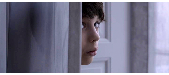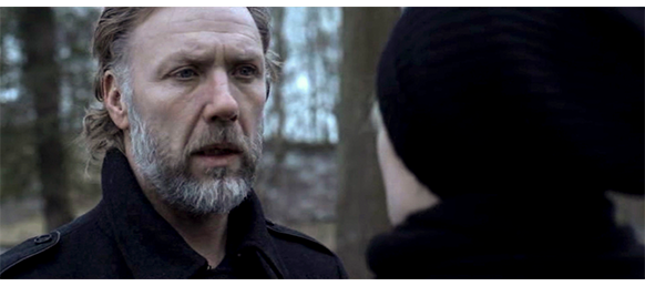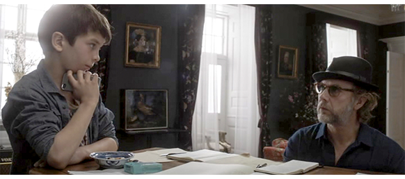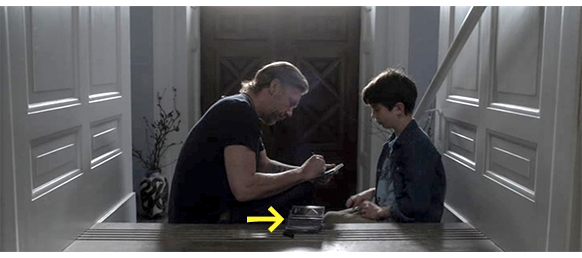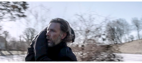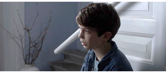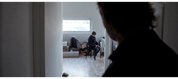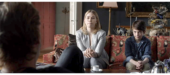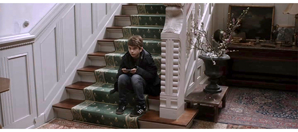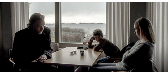 前節最後に、翌日のスタジオのシーンを入れたのは、次の場面との間に1日経過したことを明確に示すため。トーマスがスタジオからの帰り、館の前に差し掛かると、妹の車が停めてあったので、“昨日来たばかりなのに” と驚く。そして、玄関から入ると、階段にノアがスマホを持って座っている(1枚目の写真)。「今日は」。「ここで、何してる?」。「ママはトイレだよ」。すると、母がトイレから出てきて、「ごめんなさい。フィリピン人がここで待っててもいいと言ったので。話し合いが必要なの」と言うと、ノアに聞こえないようドアを閉めてくれとトーマスに頼む。娘が、「電話すべきだったと思うけど…」と言い始めると、トーマスは 「止めろ。黙って、私の言うことを聞くんだ。勝手にやって来たり、ドアを閉めろと命じたりするな。どうした、何が欲しい? もっと金が要るのか?」と訊く。返事は意外なものだった。「上司は、私が病気だと言ったわ。明日の朝から6週間のリハビリに行かないといけないの。でないと、解雇される。会社の方針で」。「分かった」。「ノアは、明日一人で起きて、ちゃんと宿題をする」(2枚目の写真)。その言葉にトーマスはドキリとして 「待て」と言うが、娘は無視して続ける。「彼には父親がいない」。「いいか、私は働いている。スタジオでレコーディングしてるんだ」。「なら、私は解雇される」。「私は働いてる」。「じゃあ、私はどうしたらいいの?」。「私は働いている」。「母は亡くなって、他に誰もいないの」。「友だちぐらいいるだろ?」。娘は首を横に振る。「私はスタジオで働いてる。レコーディングだ。私にはできん。無理だ」。娘は、じっとトーマスを見つめる。その凝視に耐えられなくなったトーマスは、思わず、「Fuck」と英語で言ってしまう。それを、“了解” と解釈した娘は、「ありがとう」と言って、ドアを開けて出て行こうとする。トーマスは 「ダメだ、待て。そんなこと…」と言うが、娘はドアから出て外に向かう。次のシーンでは、館の外で、娘がノアに話しかけている。「これからは、決めるのはお祖父ちゃん。だから、ちゃんと従いなさい」(3枚目の写真)。「うん」。「ママはストレスが溜まっちゃったから、ストレスを解消しに行くの」と嘘を付くと、ノアを抱き締め、「愛してるわ。とっても」と言う。それを、少し離れてトーマスが見ている。それが終わると、娘は、トーマスにはもう何も言わず、車に乗って出て行く。