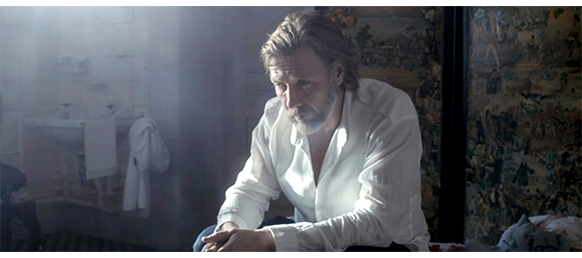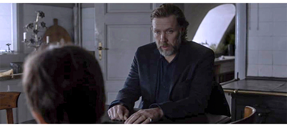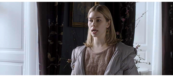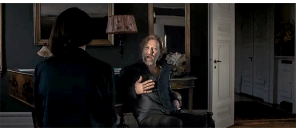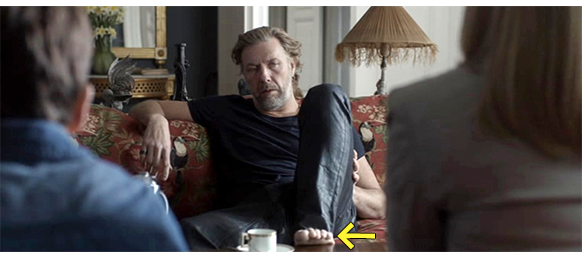 日曜になり、トーマスの1人しかいない子供(娘)が、11歳になるノアを連れて館にやってくる。娘とは何年ぶりに会ったのか分からないし、ノアとは初対面かどうかも分からないが、2人の前に座ったトーマスの態度は、まともな “父と祖父” とは思えない(1枚目の写真、矢印は、テーブルの上に乗せた足の指)。娘は、「私たち、TVを見たわ」と言い、ノアを向きながら、「ノアは、あなたがお祖父ちゃんだなんて素敵だって。彼、ギターも弾くのよ」と言い、2人してトーマスを見る(2枚目の写真)。トーマスは、何も言わないし、表情も変えない。娘は、さらに、「CDのレコーディング?」と訊き、トーマスは 「ああ。明日から始める」とだけ。「ロスから直接来たの?」、「ああ」。「じゃあ、時差ボケがあるわね」。「少し」。ノアの母は、トーマスと内緒話がしたいので、「あなたのCDに、お祖父ちゃんのサインが欲しいなら、取ってらっしゃい」と席を外させる。玄関の閉まる音が聞こえると、娘は、ストレートにお金を貸してくれるよう頼む。マンションを購入したので、必要なものを買うお金が足りないからで、金額は6万クローネ〔当時の約120万円〕。娘が、借用証書について口にすると、トーマスは マネージャーと話すよう言う。娘は トーマス「私の上司は、数年でパートナー〔共同経営者?〕になれるって」と話すが、その時、鼻血が出て来たので、ハンカチで拭う(3枚目の写真)〔コカインの長期的な鼻からの吸引は、鼻血の原因となる〕。自分も麻薬中毒だったトーマスは、これでピンときて、自分の二の舞かと失望する。