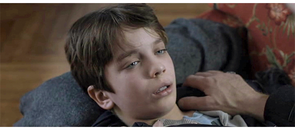 それから、何日後かは分からない。トーマスのアイフォンに母から電話が入る。「ママ? 僕 元気だよ。泣いてるの? もしもし? ママ? 何言ってるのか聞こえないよ。ママ?」(1枚目の写真)。そして、電話は切れる。麻薬の禁断症状でかなり異常だ。ノアは、ピアノで曲想を感じている祖父の前まで行くと、創作の邪魔になることなど考えもせず、「電話、切れちゃった。いつ、ママに会いに行けるの?」と訊く。祖父は、邪魔されたことに文句など言わず、「ママは、一人にしておかないと」とだけ言う。「ママは、僕に来て欲しくないの?」。「何か別のことをしたらどうだ? なぜ、何かしない? なぜ、そこに立ってる? なぜ、ギターを弾かない?」。「そんな気分じゃ」。祖父は、昔のことを話し始める。「私の父は豚みたいに飲んだ〔当然、酒を〕。踊ったり、喧嘩したり」(2枚目の写真)「彼は暴力的で、私をよく殴った。私が何をしたか分かるか? 音楽を聴いたんだ。サン・ハウス〔ミシシッピー・デルタ・ブルースの最も偉大な歌手の一人〕を聴いた。全てが消えた。素晴らしかった。演奏は下手だった。だが、何かがあった」。「僕も下手だよ」。祖父は、あまりにバカな返事に 「そういう意味じゃない。分かってないな。ギターを弾いて来い」と追い払う。