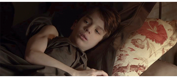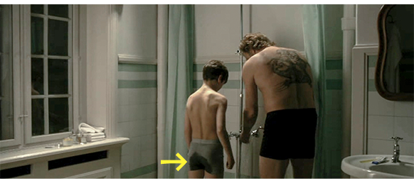 恐らく、その日の真夜中、上半身裸で、腰にタオルを巻いたノアが、祖父の寝室にやって来て、体を押して起こす(1枚目の写真)。「どうした?」。「怖いよ」。「何が」。「怖いんだ」。「明かりを点けて部屋に戻るんだ」。「ここで、一緒に寝てダメ?」。「自分の部屋に行って寝るんだ。ここでは眠れない。私は、他の人と一緒には寝られないんだ」。この言葉で、ノアは正直に打ち明ける。「ベッドを濡らしちゃった。毛布も」。「バスルームに行き、シャワーを浴びろ」。そう言うと、ベッドから起き上がり、一緒にシャワールームまで行く(2枚目の写真、矢印は洩らした後)。祖父は、ノアに自分で洗わせ、すべてが終わると、洩らしたベッドでは寝せられないので、自分のベッドで寝せる。そして、朝になり、先に目が覚めたトーマスは、ノアの寝顔をじっと見つめる(3枚目の写真)。そして、ベッドに腰かけると、じっと考え込む。