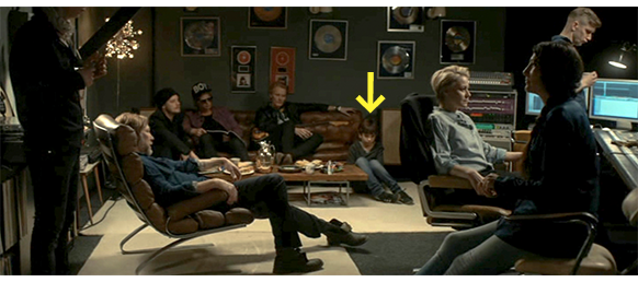 その直後の場面は、再ビ、モリーのスタジオ。モリーは、打ちのめされたノアを心配そうに見ている。一方、トーマス横に陣取ったマネージャーは、彼に報告する。「リハビリセンターは、ジュリー〔トーマスの娘〕の荷物を送りました。弁護士は彼女のマンションを売ってくれます。私たちが考えなければならないのは、ノアをどうするかです。親権に関する書類にサインする必要があります。家具は、彼が18歳になるまで保管されます。ここに、2つの立派な寄宿学校のパンフレットがあります」。そう言うと、マネージャーは2つのパンフレットを見せる(1枚目の写真、右の矢印がパンフレット、左の矢印はノア)。「私は学校に電話しました。好きな時に見に行けるそうです」。「分かった、ケイト」。ノアは、2人の方を見ているが(2枚目の写真)、途中にガラスの仕切りが入っているので、何を話しているのかは聞こえていない。