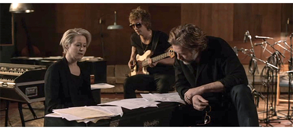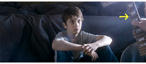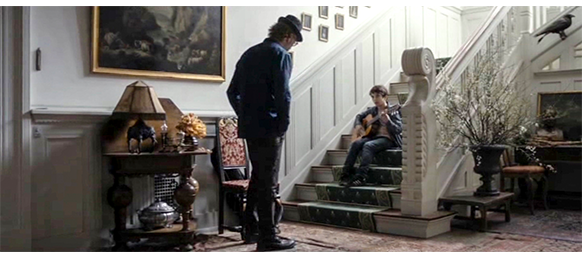 ノアが階段でギターを弾き始めると、音程が狂っているので、我慢できなくなったトーマスは、階段まで行く(1枚目の写真)。そして、「チューニングしないと」と言ってギターを受け取ると、調整しながら、「演奏は どうやって覚えた?」と訊く。「ギターに付いてたDVDで」。調整を終えてギターを返すと、「どんなコード〔和音〕を知ってる?」と訊く。ノアは音を出しながら、「GとCとD7」〔すべてメジャーコード〕と答える(2枚目の写真)。「マイナーコード〔暗い響きを持つ音〕は、ないのか?」。ノアは首を横に振る。トーマスは もう一度ギターを受け取ると、Aマイナーの弾き方を教え、ギターを渡すと自由に弾かせて、「リズムを作って、流れるように」と指導する。ここで、場面は変わり、モリーのスタジオで、レコーディングが始まり、モリーはノアを呼んで、正面のガラスの仕切り越しに トーマスが歌っている姿を見せる(3枚目の写真)。