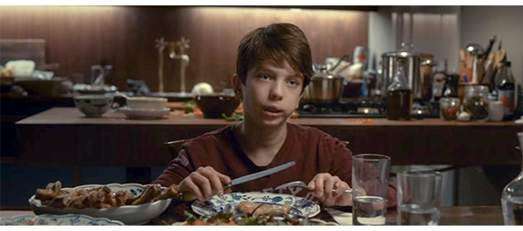 その夜の夕食。ピンポンは、それまでのトーマス用のメニューと違い、ノア用にも料理を作ってくれ〔鶏のもも肉のローストが5-6本〕、「食べて、可愛い子」と頭を撫でる。ノアは、さっそく1本皿に取り、「なぜ肉を食べないの?」と祖父に訊く。「人間にとって肉は大敵だ。破局につながる」と、ベジタリアンの食事を食べる。「僕、肉が好きだよ。ママは、いつもはあんなにストレスないんだ。昇進したし、大きくて新しいマンションを買ったんだよ。僕、アイフォンもらっちゃった」(1枚目の写真)。祖父は、「ママには、ストレスなんかない。麻薬をやってるんだ。コカインを」と真実を話す。すると、ノアは 「ママは、マリファナタバコも吸うし、錠剤〔エクスタシー?〕も飲むんだ」と話す。「ママは6週間 施設にいる。そしたら、解放される」。「閉じ込められるの?」(2枚目の写真)。「必ずな。そこにいると、気が狂いそうになる。出て行きたいと思う。だが、いないといけないんだ」。「いいママだよ」。「そうだな。肉を食べるんだ」。ノアが初めて館で眠る夜。祖父が、「お休み」と言って照明を消すと、「お願い、明かりは点けておいて」と頼む。スイッチをONにすると、「もう一つお願いがあるの。英語の本を家に忘れてきちゃった。箱の1つに入ってる」。「じゃあ、明日一緒に取りに行こう」(3枚目の写真)。「お祖父ちゃんは、どこで寝るの?」。「廊下の先だ」。「ドアは開けたままにしておいて」。いずれも、トーマスにとっては、これまで味わったことのない経験だ。
