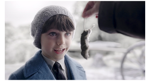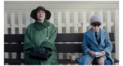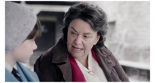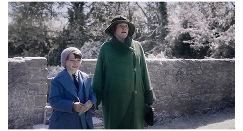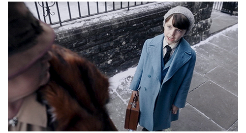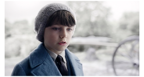 一面の雪の中を、ポターの家から離れながら、母は 「ポターさんには会えたの?」と訊く。「よく分かんない。あの人だったかもしれないし、魔女だったかもしれない」(1枚目の写真)。「それなら、彼女がまた戻って来て、私たちをヒキガエルに変えてしまう前に、急いでここから離れないとね」。「ヒキガエルじゃない、ネズミだよ」。「急いで、走るのよ」。ポターの家では、農場管理人のトムが、次のハードウィックの群れを 放牧地に連れて行くので、一緒に来なかと誘いに来る。その時、アンは ようやく奪い返した帽子の汚れを少しでもきれいにしようと必死だ(2枚目の写真、矢印)。そして、最後に、ネズミのしっぽをちょん切るストーリーをそのまま採用することに同意する。ポターは、トムと歩きながら、トラウトベック・パークの購入をどう思うか尋ね、当然手に入れるべきとの返事を受けて、購入を決意する。そして、サンタ宛のアストリの手紙を投函する。農場から数百メートル離れた土道を歩きながら、ロアルドが突然言い出す。「いいよ」。「何が、いいの?」。「学校に行く」(3枚目の写真)「そうすれば、ママに話す物語ができるよね」。「そうね、いっぱい」。「今、子ネズミは冒険が終わったことを知った。しかし、これから、どんなネズミにも待ち受けている別の冒険が始まる。それに飛び込むには、勇気と心の支えが必要だ。しかし、困難な時期や栄光に包まれない日々もあることを忘れないように。ネズミからのアドバイス。ネズミ〔つまり、他の人間〕から学ぶこと。そして、魔法をすべて否定してしまわないように。独自のストーリーを創造なさい」。4枚目の写真は、映画の最後に表示される 子供時代のロアルドと母。