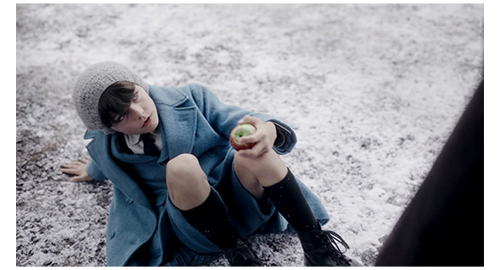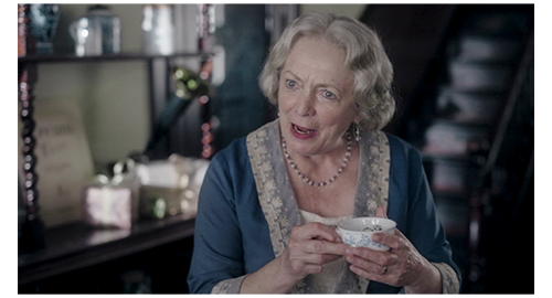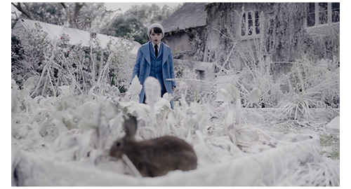 ロアルドの母は、町のカフェの前で体を休めていると、親切なマダムが、閉店したところなのに、外は寒いので中に入れてくれる。さっそく紅茶をテーブルまで持って来てくれるが、ロアルドの母の様子があまりに変なのに気付き、「旦那さんが出てってたのね?」と訊く。「いいえ」。「亡くなったじゃないわよね?」。「今週、肺炎で。でも、その2週間前に、娘の盲腸が破裂して。お金もほとんど使い果たしたの。その締めくくりが、私の末っ子。アヒルのジマイマを見ようと家出して」〔“お金がない” というのは、事実と全く違っている。夫は成功した実業家なので、資産は豊富に残されたし、ヴィラ・マリーからカンバーランド・ロッジに移ったのも 夫と娘を亡くしたので 広すぎたから。カンバーランド・ロッジも、それほど小さな家ではない。少し前に紹介した “カーディフの由緒地めぐりの地図” の中で、右下隅がカンバーランド・ロッジ。現在はハウエル保育園・幼児学校(Howell’s School Nursery and Infants School)の敷地内なので、大きな写真がない〕。マダムは同情することしきり。ポター家では、アンが、経験もないのに、勝手なことを平気で、自慢げにまくし立て、最後には、ポターの怒りを買う。アンは、ポターに、「ベアトリクス」と呼んでいいかと訊き、即座に拒否される。そして、紅茶カップを手に取って飲もうとして、中に死んだネズミが入っているのを見て、真っ青になる。そのあと、窓の外に再びロアルドの姿を認めたポターは、アンなんか放っておいて、外に出て行く。ロアルドは、小屋の前に置かれた木箱に積もった雪に、自分のイニシャルを「R.D.」と指で書く(1枚目の写真)。その頃、カフェでの母とマダムの話は佳境に入り、マダムが、紅茶占いをする。最初は信じなかった母だが、最後に、「あなたの息子さん、作家になるわ。すごく有名な」と、驚いたように言うと(2枚目の写真)、「本当なの?」と興味を持つ。マダムが、さらに、「でも、お子さんは決して髭を生やさない」と言うと、母は急に相好を崩し、「あなたを絶対信じるわ」と笑顔で言う〔以前、階段下の物置で、ロアルドが「僕は髭なんか絶対生やさないから」と言ったのを覚えていた〕。ポターは、庭を探し回り、書かれたばかりの「R.D.」の文字を見つけると、そぐ前の小屋に入って行く(3枚目の写真、矢印はロアルド)。ポターは、中に誰も発見できなかったので、「いつか、見つけてやるよ、この蛆虫小僧。そうなったら、どうなるか覚えておくがいい。踏み潰されるだよ!」と息巻き、小屋を出て行く。