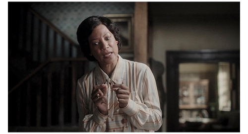 そのポターの家。彼女が帰宅すると、夫から若いレディが応接室で待っていると告げられる。ポターは、トムからもらったネズミの死骸を入れたティーカップを持って応接室に行く。そこで待っていたのは、アン・ランディという、黒人との混血女性だった(1枚目の写真)。これは、実在しない人物で、この映画の中の最大の “失敗したキャラクラー”。なぜ “失敗” なのか? ①『ロアルドとベアトリクス』という題目の実質本編68分という短い映画の中で、2人とは無関係な、かつ、歴史上存在しないアン・ランディの登場場面が5回、計10分(15%)もあること、②アン・ランディはウォーン社からの指令でやってきた社員という設定だが、1920年頃のポターは、ランディ社の破産後、1919年に新会社が設立された際の最大の債権者であり、新会社に大きな影響力持っていた(https://www.e-reading.life/)。そんな “偉い” 人の所に、一介の生意気な社員を寄こし、しかも、ポターのストーリーに改変を強く迫るようなことなどあったはずはなく、歴史を歪曲している、③20世紀初頭の英国の黒人人口は約2万人でそのうち女性は5,000人前後程度と推定されている(https://www.findmypast.co.uk/)。それに、1919年には、大規模な人種暴動が起きている。黒人との混血女性が、このような重要な役目を仰せつかるような社会情勢では全くなかった。以上3つの理由による。ポターがアンに煩わされている頃、ロアルドと母は、ポターの農場の前までやって来る。ロアルドは、「絵本の中の挿絵と同じだね、ママ」と喜ぶ(2枚目の写真)。ロアルドは、「ありがとう」と言って母に抱き着くと、すぐに帰り始める。母は、「これで終わりなの?」と驚く。「もう、見たから」。「ダメ、ダメ。こんなに長く旅して来たのは、意味もなく計画を諦めるためじゃないわよ〔boil away to nothing in cabbage/ノルウェーの “Å koke bort i kålen” という諺の英訳〕。入って行きなさい」。「出来ないよ。許されてない。あそこに書いてある」。「まあ、søppel(バカげてる)。あなた、ノルウェー人なのよ! 英語なんか読めない振りすりゃ いいじゃないの」。「一緒に来てくれない?」。「あなたの冒険に、ママがいつも一緒だったら、話すことがなくなってしまうでしょ」。「そうかも」。「ママが、おばあちゃんになって、毛布で膝をくるんで家から出られなくなった時、あなたには、広い世界で見聞きしたことを話して欲しいの。じゃあ、冒険に行ってらっしゃい。1時間で戻って来るわよ」(3枚目の写真)。