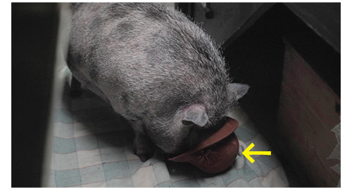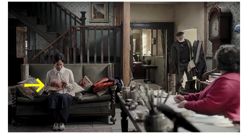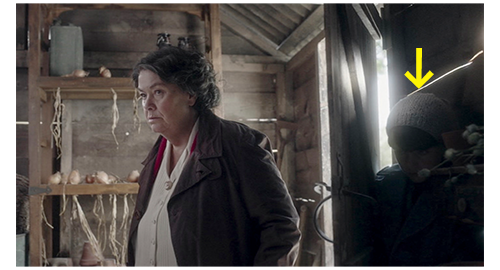 ロアルドは 走って行き、門のところで待っていた母に抱き着く(1枚目の写真)。しかし、ロアルドは気付かなかったが、ロアルドが逃げる時、アストリの人形から預かった “サンタクロースに宛” の封筒を落としてきてしまい、それをポターが拾い上げて読んでみる。映画で紹介されるのはロアルドに関する部分だけ。「…それから、ロアルドに新しいベアトリクス・ポターの本をあげてくださいません? 彼は、私に 古い本を全部、何度も何度も読んでくれましたが、私、何か新しいものをすごく聞きたいんです…」。家の中に戻ったポターは、待っていたアンに、これまで自分の本の中では、ウサギはパイに焼かれ、アヒルの卵は猟犬に食べられ、ネズミが子猫を食べるけれど、子供たちは その試練を乗り越えてきたこと。そして、「確かな筋の情報によれば、子供たちはもっとずっと悲惨なことにも向き合ってきたのよ」と言うなり、包丁を取り上げると、机の上に置いてあった死んだネズミの尾を叩き切る(2枚目の写真)。気持ちが悪くなったアンは、別の変な音にも気付き、長椅子を廻り込んで見てみると、イノシシのサリーが、アンのクローシェ帽に頭を突っ込んで何か食べている(3枚目の写真、矢印)。アン:「私の帽子が! やめさせて!」〔丁寧語ではない〕。ポター:「自分でやれば?」。アンはイノシシから自分の大切な帽子を奪おうと必死にトライし、ポターはそれを笑って見ている。