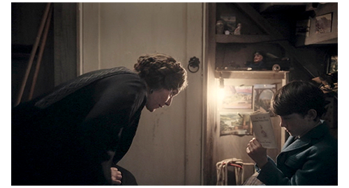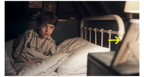 映画の冒頭、ベアトリクス・ポターが暗いランプの光で絵を描こうとした時、弁護士の夫が先に2階に上がって行く。それを見たポターは、ランプに手を伸ばし(1枚目の写真、増感)、火を消してから2階に向かう〔ポターの目が悪くなったのは、暗いランプの元での描画が一因だとされている〕。その後、映画は 1つの空想上のドールハウスに焦点を当てる。ハウスが開き、中の多くのライト(当時としては先進的な電灯)が点くと、そこに住んでいるのはネズミの人形。これは、映画の副題が、「The Tail of the Curious Mouse(知りたがり屋のネズミのしっぽ)」となっていることと大いに関係がある。このあらすじでは、ネズミの人形の場面はすべてカットしたが、実際には、何度も挿入される。最初の場面だけ紹介しておくと、ナレーションが入る。「知りたがり屋の子ネズミ〔ロアルド・ダールの分身〕が、部屋からゆっくりと出て行き、彼の父親〔ハラルド〕が死んだことを知った。姉〔アストリ〕が遺体安置所に運ばれる前に、この医者を見たことがあったので、子ネズミは、大人たちは平気で嘘を付き、この世界に魔法なんかないんだと悟っていた。どんな悲劇だって起きてしまう。すべてのネズミが、年を取るまで生きられるわけではない。だから、悲しみが襲われると、彼は、大好きなお話の中に逃げ込むしかなかった」。子ネズミは、自分の部屋に逃げるように戻ると、ベッドに飛び込んで絵本を読み始める。すると、場面が移動し、ロアルド・ダールがベッドの中で、懐中電灯を点けて絵本を読んでいる姿に替わる(2枚目の写真)。足音が近づいてきたので、ロアルドは、①懐中電灯を消し、②絵本を布団の中に入れ、③壁の方を向いて横になる。すぐに、母がドアを開け、ざっと様子を見て すぐドアを閉める。母がいなくなると、ロアルドは、ベッドサイドテーブルの上に置いてある父の写真をじっと見て、ノルウェー語で「Ha det, papa(さよなら、パパ)」と言う(3枚目の写真、矢印は写真立て)〔英語字幕は刷り込み〕〔ロアルドの両親はノルウェー人〕。写真立ての中の父は、「Ha det, Roald(さよなら、ロール)」と言った後で、英語で 「ママを頼む」と言う。ロアルドは、写真立てを抱いて眠る。