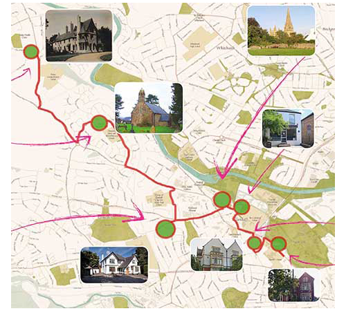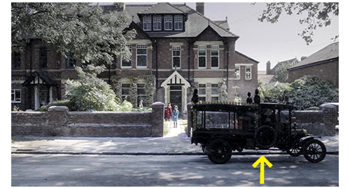 翌朝、12月下旬なので、一面にうっすらと積もった雪の庭に出て来たポターは、「サリー」と呼ぶ(1枚目の写真、冒頭の解説の2枚目の写真と対比すると、それなりに似ている)。しばらくすると、丸々と太ったイノシシ〔サリー〕が現われる。ポターは、「私たちの年頃のレディには、外は寒すぎると思わない?」と話しかける。そして、空を仰ぐと、雪が舞っている。上空からのポターの映像が、上空からのロアルドの映像に切り替わる。すると、葬儀屋の車が家の前に着く(2枚目の写真、冒頭の解説の1枚目の左上の写真と対比すると、全く似ていないし、そもそも、戸建て住宅ですらない)。ロアルド・ダールは、ハリー・ポッター以前は、児童文学のNo.1だったこともあり、ロアルドが子供時代を過ごしたカーディフの由緒地めぐりの地図も作られ(3枚目の図)(https://livingmags.co.uk/)、その中に、ヴィラ・マリーも載っている(左下)。誰でも知っている家なのに、なぜ、こんなにかけ離れた家を撮影に使ったのか? 雪を楽しんでいたロアルドは、黒い服の葬儀屋が門の所に現れると、急に不安になる(4枚目の写真)。