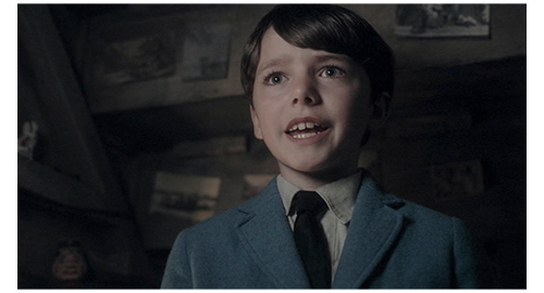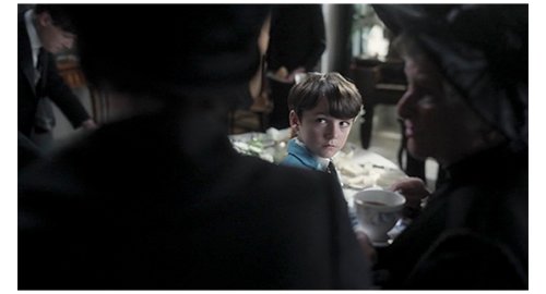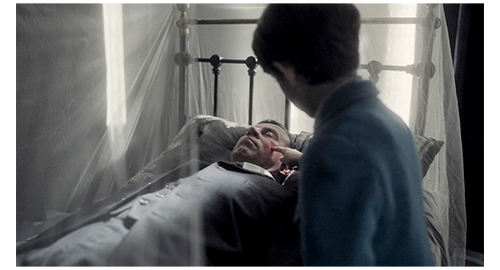 そこに母がやって来ると、「もうお別れしたの?」と訊く。ロアルドは、僅かに首を横に振る。母は、「お姉ちゃんを亡くしてすぐだから辛いわよね。でも、パパに さよならを言いたいなら、これが最後の機会よ」と 優しく話しかける。「一緒に来てくれる?」。「もちろん」。ロアルドはフラワーリースを手に持ち、母はロアルドの手を握ってドアの前に立つ。「部屋に入ったら、パパはベッドの中よ。でも、もう本当のパパじゃないの。分かる? 体があるだけ。だから、見たくなければ、目をぎゅっとつむっていなさい」とアドバイス(1枚目の写真)。中に入ると、父が寝かされたベッドを、白くて薄い布が蚊帳のように覆っている〔正式名称不明〕。母と葬儀屋が連れ立っていなくなると、ロアルドは、顔が見えるように、薄い布が「ハ」の字型に開いている所から父の顔を覗く(2枚目の写真)。そして、「パパ?」と声を掛け、指先で父の “いつもとは違う赤い頬” に触る(3枚目の写真)。ロアルドが指を見ると、指が赤くなっている(死に化粧の頬紅が付いた)。そして、そこに入って来た葬儀屋は、ロアルドが父から離れて立っているだけなのに、なぜか、「そこの子、遺体から汚い手をどけるんだ」と叱る〔編集ミス?〕。