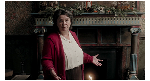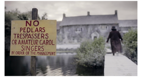 ポターの農場では、6人の住民がやって来て、玄関でクリスマス・ソングを歌い始める。しかし、ポターは、その前から、クリスマスに食べるガチョウを捕まえようと、包丁を持って追いかけ回しているが、逃げ足が速いので捕まえられない。そして、歌っている人々の前を逃げて行くガチョウに向かって、「勝手にするがいい〔have it your way〕! だけど、絶対に クリスマス・ディナーにしてやるからね、セイゴ!」と怒鳴り、すぐ脇の柵の中にいるウサギに向かっては、「そんな顔で見なさんな、タペニー」と叱る。その後で、歌っている6人には、「聞いてないよ!」「黙ったら〔do shush〕?」と、善意の行為を無視する。1人の男性が、「クリスマスおめでとう、ミス・ポター」と声を掛けると、「ヒーリス夫人でしょ」と文句を言った上で(1枚目の写真)、「私の地所に不法侵入しないでいただきたいわね」と抗議して、家に入ってしまう。一方、父の死体が横たわっている部屋に通じる廊下では、「パパに」と書いたフラワーリースを手に持ったロアルドが、ドアの前で中に入るのをためらっている。とうとう諦め、廊下にイスを持ってきて、リースを床に置き(2枚目の写真)、ポターの『あひるのジマイマのおはなし』を読み始める(3枚目の写真)。