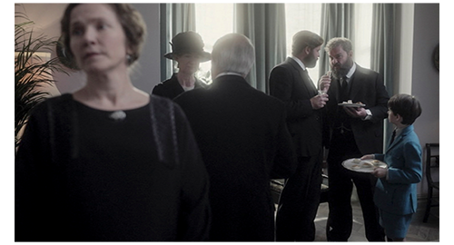 ポターは、農場の入口に警告看板を立て、家に戻って行く。そこには、「行商人、不法侵入者、素人の聖歌歌手 入るべからず」と書かれている(1枚目の写真)。一方、ロアルドは、埋葬後のパーティで、トレイにスナックを載せて来客の間を廻る役をさせられている。老女が、若い女性に、「小さな女の子を埋葬してから 1ヶ月も経たないうちに、今度は夫が死ぬなんて 耐えられないわね」と話しているのを聞いたロアルドは、じっと2人を見る(2枚目の写真)。ロアルドは、今度は、2人の男性に近づいて行く(3枚目の写真)。