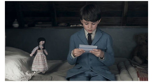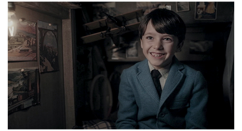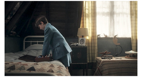 ポターの夫は、眼鏡屋を呼んだ理由を、「本を書く助けになると思ったからだ」と言うと、ポターは、「目とは関係ないの。もう、いまいましい本を書くのが嫌になったの」と、夫にとっては 意外な返事をする。さらに、「ウォーン〔出版社〕は、何を書こうが 無関心」(1枚目の写真)「全くの白紙委任。うさちゃんの本なら、内容なんかどうだっていいの。もう、うんざり」。ここで、夫は、トラウトベック・パークの話を持ち出すが、1920年という時代設定の割には、少し早いような気がする〔ポターが購入するのは1927年〕。一方、ロアルドは、学校になんか行かされたくないので、家出をしようと 必要なものを鞄に詰めている(2枚目の写真)。荷造りが終わり、母に気付かれないように、布団の下に丸めたクッションを入れて、あたかも寝ているように細工し、いざ部屋を出ようとすると、少し前に死んだ姉アストリのベッド〔ロアルドのベッドの隣〕の上に置いてあった人形が「ロール」と呼びかける〔現実と夢が交差している〕。「家出するの?」。「多分ね。一緒に来たいなら、鞄の中に入れてあげるよ」。「結構よ。アストリが戻って来る時のために、ベッドの上にいないと」。「もう戻って来ないよ」。「分かってる。行く前に、頼みを聞いてくれる?」。人形は、そう言うと、枕の下から封筒を取り出す。「アストリが書いたの。投函されなかったから、心配してたの」。ロアルドは封筒を受け取って、中の手紙を読んでみる。それは、サンタクロースに宛てたものだった(3枚目の写真)。ロアルドは投函を約束して、部屋を出て行く。
