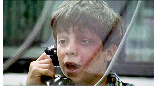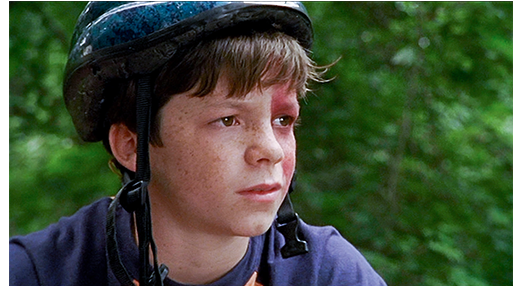 画面は黒。虐めっ子の声だけが聞こえる。「お前の尻に3つ目のアザをつけるぞ。ホッケーマスクを剥ぎ取って、お前のケツの穴に突っ込んでやる〔shove it right up your butt〕!」。ここから映像が始まる。2人の男の子が森の中を逃げるように自転車をこいでいる。前を行くのはルディ、ホッケーマスクはジェイコブ(1枚目の写真)。双子の兄弟で、2人が走っているのは、父の所有する4ヘクタールの森の中。2人はツリーハウスに着く。ジェイコブの頭に投石が当たる。先ほど、汚い口調で罵った虐めっ子たちが投げたものだ〔父の所有地といっても、自然の森なので出入りは自由〕。ルディはいち早くツリーハウスに上がり、何事にも遅いジェイコブが昇ってくるのを助けてやる(2枚目の写真)。ジェイコブが中に入ると、ルディはさっそく窓の下に置いてあった大きなバケツのフタを取る。「それ何?」。「しょんべん」〔この会話から、ジェイコブは、このツリーハウスにあまり来ないことが分かる〕。2人の不良が梯子を登り始める。すると、先頭のケニーの頭目がけて、ルディは小便を浴びせる(3枚目の写真)。ケニーは、「お前と、くそウザい〔ugly-ass〕弟を殺してやる」と怒鳴り、上から嬉しそうに見ていたルディは、「いつでも待ってるぞ、アホンダラ〔dickhead〕」とあざ笑う。