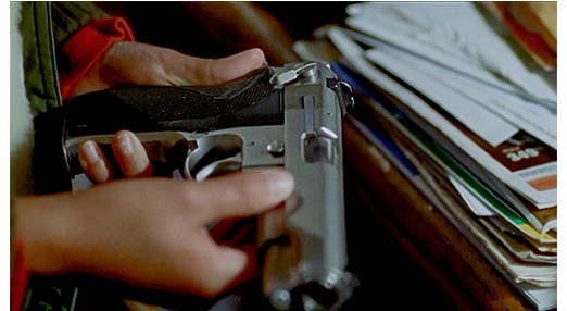 場面は再び少年刑務所。しかし、今まで違い、ジェイコブはガラス越しの電話ブースではなく、公道に面したフェンス越しに 屋外で集団休憩中のケニーを見ている〔そんなことが可能なのか?〕。それに気付いたケニーは、フェンス際まで来ると、「いったい何の用だ?」と食ってかかる。ジェイコブは、「ジェフのことは、ごめん」と謝る(1枚目の写真)。「お前が 気にするって〔give a shit〕!? 聞いた時、踊り出したんだろ」。ジェイコブは、その言葉にうなだれる(2枚目の写真)。それだけ言うと、ケニーは元いた場所に戻り、頭を抱えて泣き出す。それを見ているジェイコブも辛そうだ〔この重要なシーンも、ちょうど1分〕。その後に、メイリーのシーンが4分45秒も続く。メイリーが夜、ガスの借りている家を訪れたが、留守だったので、こっそり忍び込む。メイリーは勝手に引き出しを開けて回るが、中で唯一重要なのは、そこで拳銃を発見する場面(3枚目の写真)〔重要な伏線〕。その直後、ガスが帰宅し、メイリーはベッドの下に隠れる。ガスはシャワーを浴び始めるが、突然泣き始める。メイリーは全裸で泣いているガスに寄って行き、背中に触れようとして止める〔ジェフの自殺の後に挿入される内容としては、冗長、かつ、きわめて不適切な内容だ/しかも、メイリーが帰宅した後、母と交わす会話まで延々と聞かされる〕。