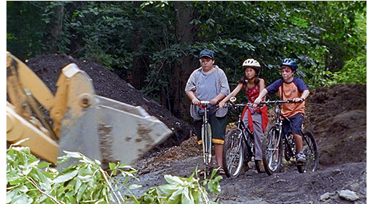 レナードが退院できてから、ジェイコブとレナードとメイリーの3人は、かつてツリーハウスがあった場所を訪れる(1枚目の写真)。森は父がディベロッパーに売り払ったので、既に宅地化の工事が始まっている。中に、あまり焦げていない窓枠1つと、床材1つをブルドーザーが撤去し、それをジェイコブが悲しそうに見送るシーンがある(2枚目の写真)〔あれほど真っ赤に燃えていたので、窓枠や床材が炭化していないハズがない→映画で「見せる」ための視覚的なごまかし〕。このシーンの後、メイリーは作業員の中にガスがいるのを見つけ 筋肉質の体に惹かれる。