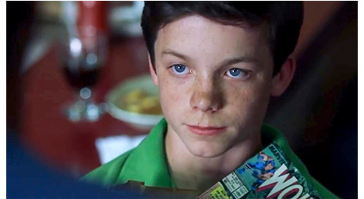 その後、ジェイコブは、食卓に1人で座って昔の写真を見ている母に、「今度は、どうしたの〔what's wrong〕?」と訊く。「あなたとルディが産まれた時の写真を見ていたの」(1枚目の写真)「あの子に会いたいわ」。「だけど、キース〔「弟」の名〕がいるじゃない」。「何が言いたいの?」。「キースをもらった。男の子が2人。すべて元通りだ」。「ルディの代わりにキースを養子にとったんじゃないわ」。「そうなの?」。「違う。お父さんと2人で何年も議論したのよ。話したでしょ」。ジェイコブは、母の曖昧な態度にキレて、思っていたことを口に出す。「もし、死んでたのが僕だったら、乗り越えるのに他の子なんか要らなかったろ」。母は、この誤解にびっくりする。「何 言ってるの? 息子に何か起きるなんて、思うハズないじゃない」。「でも、1人死んだんだ。賭けてもいい。どちらか選べるんだったら、僕に死んでて欲しかったろ」。母は言葉を失う。それでも、精一杯、心の丈(たけ)を訴える。「あなたが、『私たちはルディの方が好きだった』 と感じてたのは知ってるわ」。「そうじゃないか。認めろよ」。「あの子の方が育て易かったことは認めるけど、より愛してたわけじゃない。ジェイコブ、あなたは普通じゃない状態で産まれたのよ。挑戦だったわ」。「母斑のこと?」。「そうよ。普通と違うのは 大変なことなの」。「僕は、異常じゃない」(2枚目の写真)「いつだって、『僕は どこかおかしい』って思わせてきたじゃないか! 僕のせいじゃないのに!」。「分かってる…」。「分かってるもんか! 僕を どう扱ったらいいか分からないんだ。ずっとそうだった!」。「そんな風に思ってたのなら ごめんなさい。でも、あなたは私の息子で、あなたを愛してる。あなたのためなら何でもする。戦うことも。殺すことも、死ぬことだってできる!」。「ルディも同じこと言ってた」。「あの子は正しいわ。キリスト教の精神に反するけど、今でも願ってるの。『ルディを殺した子が死ねばいい』って」(3枚目の写真)「あなたも大きくなれば理解できるわ。いつの日か」〔極めて重要な言葉〕。夜がふけ、ジェイコブは鏡の前に立って自分自身を見つめる。これから、どうすべきか、悩んでいたに違いない。その時、鏡の中にルディの顔が見えた。ジェイコブを見ながら「それでいいんだ」とでも言うように頷くルディ(4枚目の写真)。ジェイコブの心は決まった〔母との会話を含め、4分弱の最重要の場面。ジェイコブ役のConor Donovanの演技の見せどころ〕。