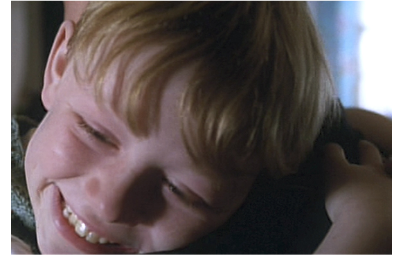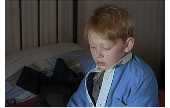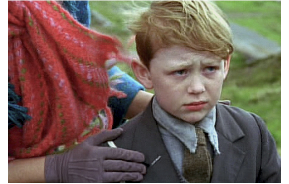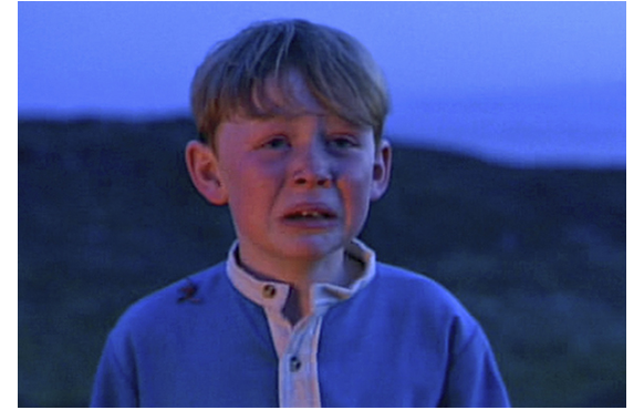 ママが病院に行くと、トマスは近所のおばさんの家に預けられた。病院からは、詳しい連絡は何もない。寂しくなって家に戻った時、ジプシーの物売りお婆さんから、ママを喜ばせようと極彩色のテーブルマットを、おばあちゃんの形見の櫛と交換する。そして、いよいよ病院に行けると分かった時、そのマットを胸に抱いて行く。病院に行くと、ママは力なくベッドに寝ている。それでも、トマスに、「きれいな色がいっぱい。感じられる?」と訊き、トマスが頷くと、「よかった。眠れるわ」と言って目を閉じる。心配でたまらなく「ママ」と何度も呼ぶが、憔悴しきったアレックの「トマス。お行き」の言葉に従う。しかし、廊下で牧師が「我々に、勇気をお与え下さい。モイアを召される時に」と祈るのを聞き、一目散にママの元に。そして「死なないで!」と泣き崩れる(これまで見た泣いた表情で、一番すごい)。アレックの「行け」との言葉に泣きながら従うトマス。