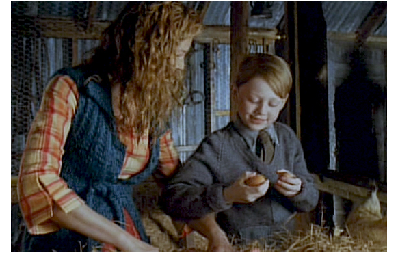 初めて家に入った後も、緊張のあまり全く口がきけない。モイアに対してもそうなので、アレックに対しては、ただ目を伏せるばかり。鶏小屋に案内されて少しリラックスするが、アレックが入ってくると、動転して卵を落としてしまう。夜は、歓迎の意味もあって、アレックの大好物の赤スグリ入りビーフシチュー。しかし、アレックが「もっと、食べたいか?」と訊いても無反応。